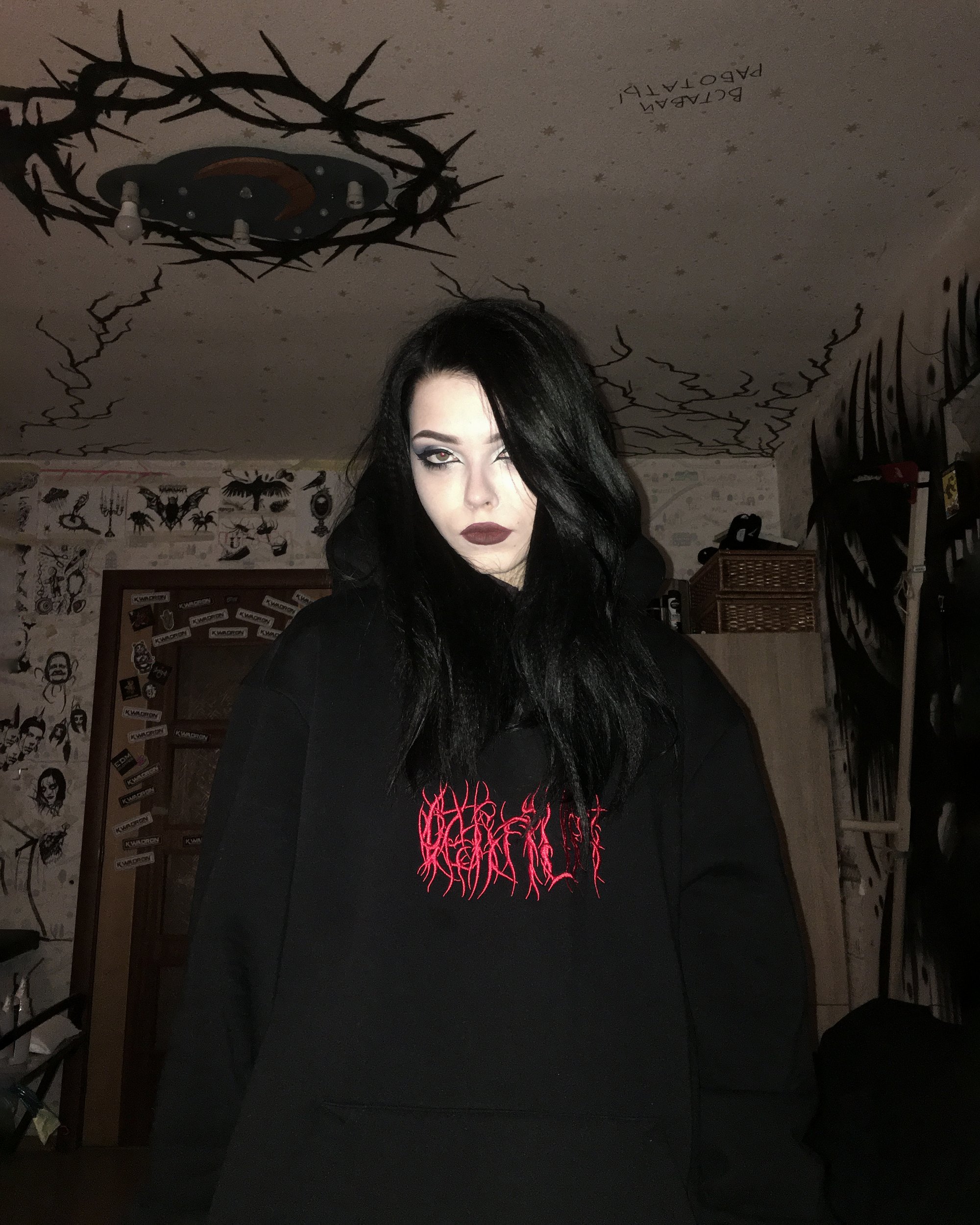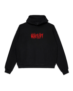 Long sleeve hoodie "Delirium" in black. Oversized unisex fit. Pocket on front. Rib-knit cuffs and hem. High quality seams. Embroidered, tribal-style caption in red.