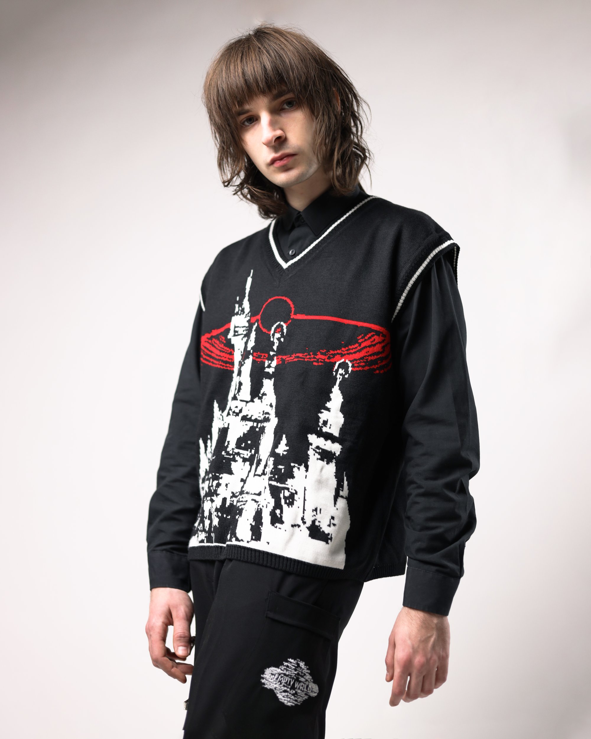Eclipse vest Oversized unisex fit. Rib-knit cuffs, bottom and hem. High quality machine knitting. Gothic-styled design. Made with high percentage of merino wool. It provides good insulation, transports moisture and has anti-static properties; it doesn't itch, smell or crease much; it is lightweight and keeps its shape.